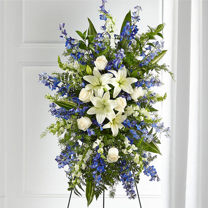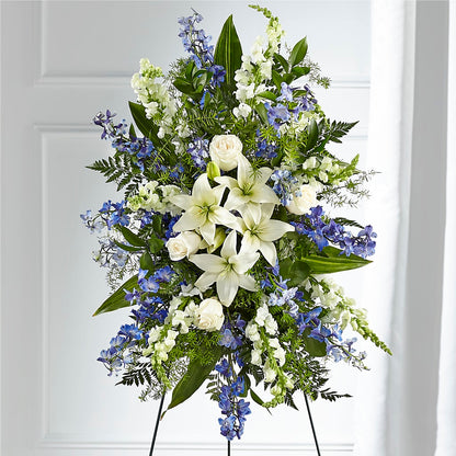 A collection of bold blue flowers shares a tribute that words cannot express. Designed with lilies, roses, delphinium and snapdragons our Faithful Friend Standing Spray is a grand gesture to express kindness and solace to a loved one.